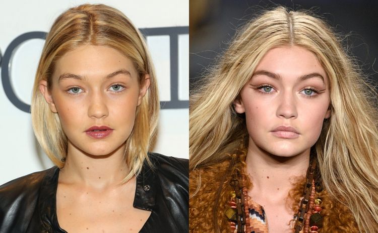 细看Gigi Hadid在2014年(左)及2015年(右)刚走红时的照片,以国际模特儿一向极瘦削的标准来说,Gigi的脸部算是有点肉,当年的媒体更形容她是有点Baby Fat,而且下巴还是微尖,眼袋和苹果肌位置没有下垂问题。