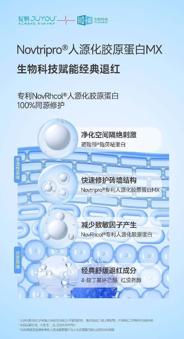 此次获奖的绽妍修红霜添加Novtripro®三重蛋白MX科技配方,模拟人类皮肤屏障成分特点,通过专利NovRhcol®人源化胶原蛋白(中国发明专利,专利号:ZL 2021 1 1391978.1)、NovRfibro®纤连蛋白和绽妍明星成分“屏障胶水”诺贻预®贻贝粘蛋白三重成分的添加,达到对屏障受损皮肤救急缓解和长效修护的协同,提升屏障修护力。同时绽妍修红霜中双重植油仿生锁水,神经酰胺E强韧屏障,依克多因深澈补水,4-叔丁基环己醇与红没药醇舒缓敏感,从外补充修护屏障“养分。