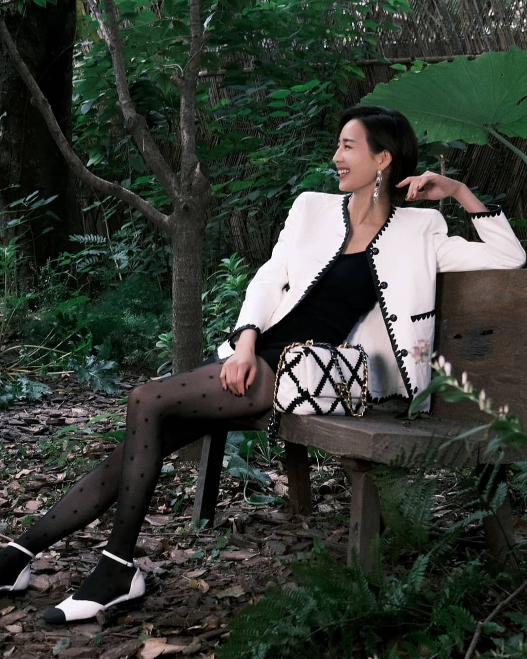 又或者学张钧甯穿上全白的香奈儿鞋及外套做出对比,让黑色的双C logo丝袜成功衬托出整体穿搭,还能在视觉上拉出身形比例,超级显瘦。