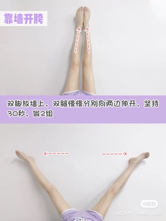 双脚靠在墙上,双腿慢慢往两边拉开延展。