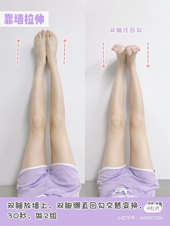 双腿放在墙上,一只脚伸直,另外一只脚往回勾,交替变化。