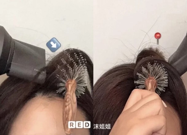如果想要进一步让发根的澎度维持更久,将圆梳放在发根下方,用吹风机加热圆梳侧边的发根和圆梳上方的头发,两处各吹整3-5秒即可~完成后记得松开圆梳的方向也很重要!将圆梳朝发逆向的发线往上梳开,才不会破坏刚刚吹整好的蓬松感~