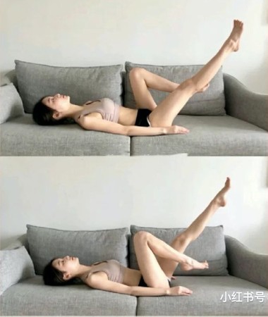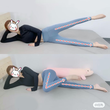 先侧躺于地面或瑜伽垫上,双腿伸直,一脚放于地上,一脚悬于半空中,将悬空那侧腿慢慢往身前弯曲,要有意识地以大腿带动小腿屈膝,维持30秒为一组,左右腿各做5组。