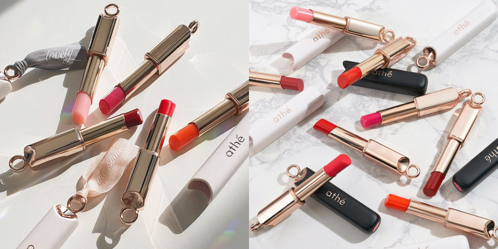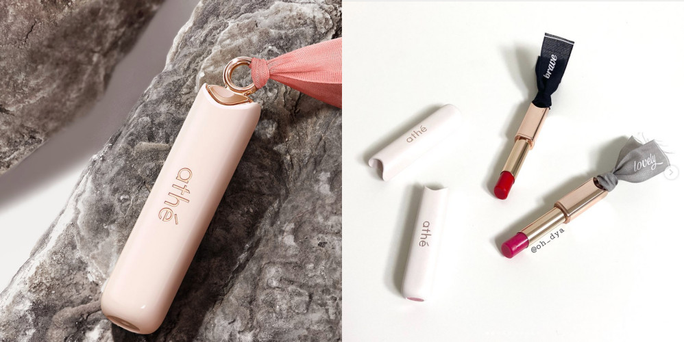 韩国新创品牌athe在几个月前成立,主打就是全素的美妆系列,以天然植萃作为主要成分,刚开始就推出非常多的产品,像是保养、颊彩、粉底等等,其中最受到瞩目的就是“缎带唇膏”系列,在玫瑰色的唇膏上面,制作出圆形的圈圈,不但可以穿过链子当作项链使用,更厉害的是还可以穿过缎带,简约短版的缎带就看起超级可爱,很有少女心。