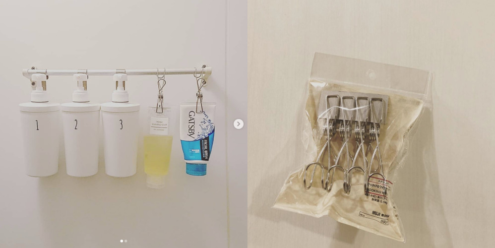 浴室里面的收纳往往最是麻烦,尤其是软管设计的洗面乳、泥膜之类的单品,用到最后绝对是东倒西歪,日本女孩就会去入手无印良品的小扁夹,直接把它们一条一条收纳好,重点是使用的时候直接拿起来或是挤一点就可以用,完全不用担心它们又掉到地上、乱成一团。