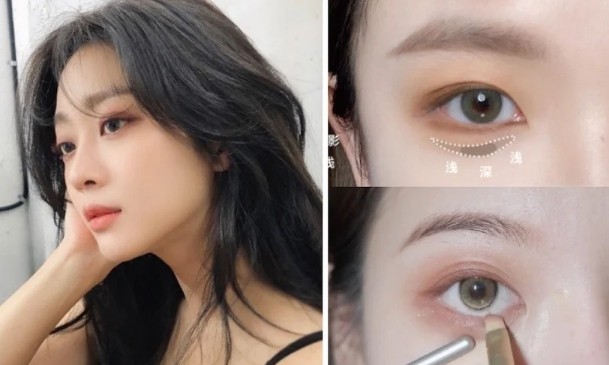 画卧蚕时,先沾取缎光香槟色眼影,勾勒下眼睑前端到卧蚕处。再用浅米棕色(或灰感的鼻影),画在比本身卧蚕再上缘一点点的位置。这样卧蚕才会更加自然、不突兀。