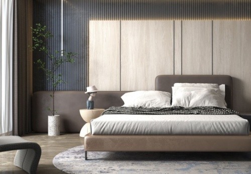 两款不同色彩的【意大利石松】分别用于墙面及地面,温暖的质地与灰色调的皮质家具形成恰到好处的冷暖比例,展现出丰富的空间层次,塑造出现代简约的“意式风格”,彩色人物摆件以及绿植的点缀让空间更具生气。