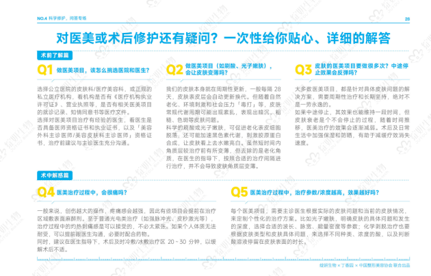 此外,针对医美常见的问题,如医美项目如何挑选医院和医生、医美项目会让皮肤变薄吗、皮肤医美治疗后为什么容易发反黑,《指南》还通过QA形式解答消费者疑问。
