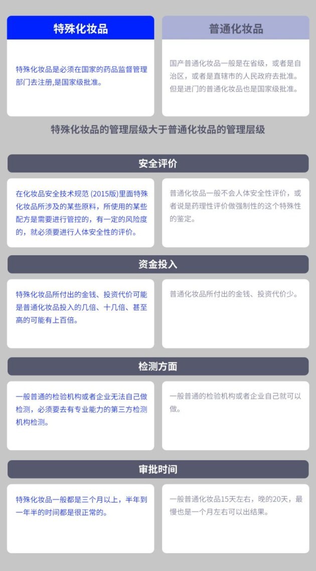 特殊化妆品相比普通化妆品,耗费更多的资金、更长的注册时间、更多的检测项目,这是对品牌、对产品、对市场的多方考验。