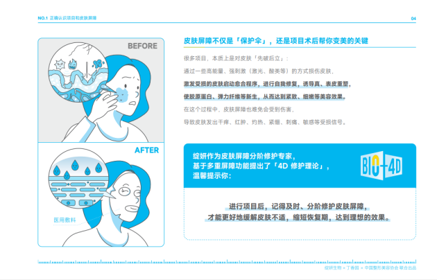 想要通过项目手段获得理想的皮肤状态并不容易。因为项目在帮助消费者实现美白、紧致等需求的同时可能也在不同程度地破坏皮肤屏障,让皮肤出现干燥、泛红、脱皮、刺痛、敏感等问题。对于项目后的修护,绽妍联合丁香园、中国整形美容协会发布的《项目术后修护科学指南》也指出,很多项目本质上是对皮肤先破后立,通过高能量、强刺激的方式损伤皮肤。项目后需要及时、分阶修护皮肤屏障,才能更好地缓解皮肤不适,缩短恢复期,达到理想的效果。