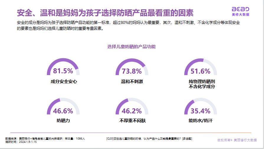 美丽修行市场研究数据显示,在当今美妆行业的飞速发展中,儿童专用防晒产品成为新的市场焦点。当前市场上,随着消费者意识的提高和科技的进步,儿童防晒产品不仅要求具有高效的防晒能力,还要求产品成分安全、温和,不刺激儿童娇嫩的皮肤。同时,产品的使用体验,如不厚重、不闷肤等,也成为家长选择产品时的重要考虑因素。
