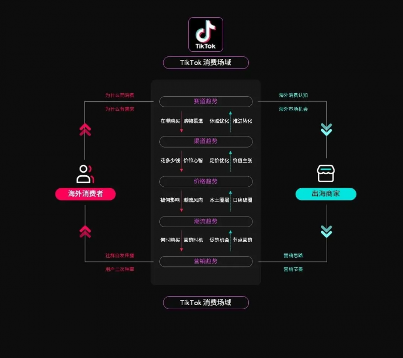 打开白皮书,可以发现报告的研究思路是围绕着“双循环价值体系”展开的。这一价值体系以 TikTok 消费场域为核心,通过赛道、渠道、价格、潮流、营销这五大趋势,将海外消费者与出海商家直接关联。
