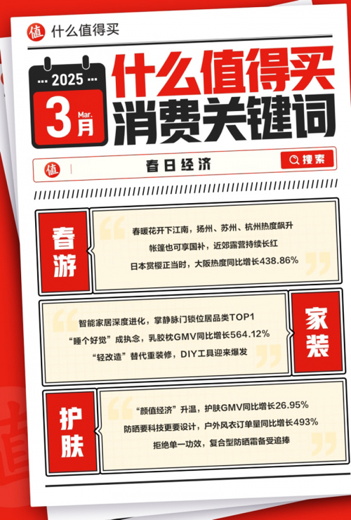 三月春色渐长,人们纷纷走出家门感受阳光,踏春赏花,春日经济热力十足。什么值得买平台内春游消费GMV同比增长25.38%,赏花踏青等“微度假”成为主流,扬州、苏州、杭州成为热门目的地,恰逢赏樱季和大阪世博会开幕在即,关西旅游热度显著上升,赴日机票次卡走红市场。家装行业也进入消费旺季,在国补政策和品牌上新的双轮驱动下,平台住宅家具和大家电迎来消费“小阳春”,低成本局部改造推动软装和收纳单品走俏市场,床品、地毯、家纺品类GMV分别同比增长29%、84.16%和62.83%。