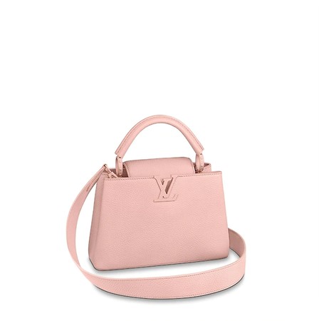 LOUIS VUITTON(路易威登)诞生于2013年的Capucines系列,以袋口LV切割为标志,粉雾浪漫配色内衬亮面小牛皮,双层隔间,可手提或以肩带肩背及斜背携带,实用性高。