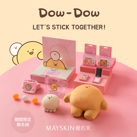 MAYSKIN优若美今夏邀请南韩超人气糯米团Dow-Dow,推出期间限定痘痘贴联名组合。由BRICKSTUDIO原创的“Dow-Dow”是韩国通讯软体Kakao Talk上的超人气角色,黄色的Dow-Dow是发酵不完全卖不出去的糯米团,白色的Mow-Mow则是甩面团时掉出来的小面团粒,两个角色相遇后过著开心的日子,各种萌翻的互动可说是圈粉无数。