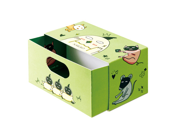 除了外盒及面膜袋上有卡哇依的厌世动物们,也延续品牌纸盒“反转再利用”的环保概念,不需要任何一道黏贴程序,只要将纸盒反转及简单剪裁,就能变身成实用的收纳小抽屉