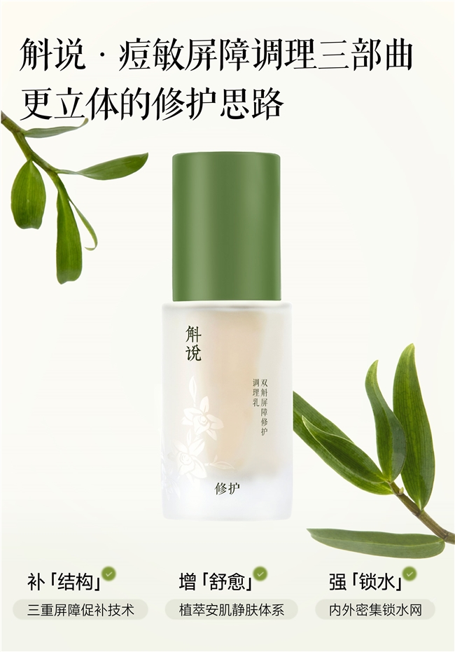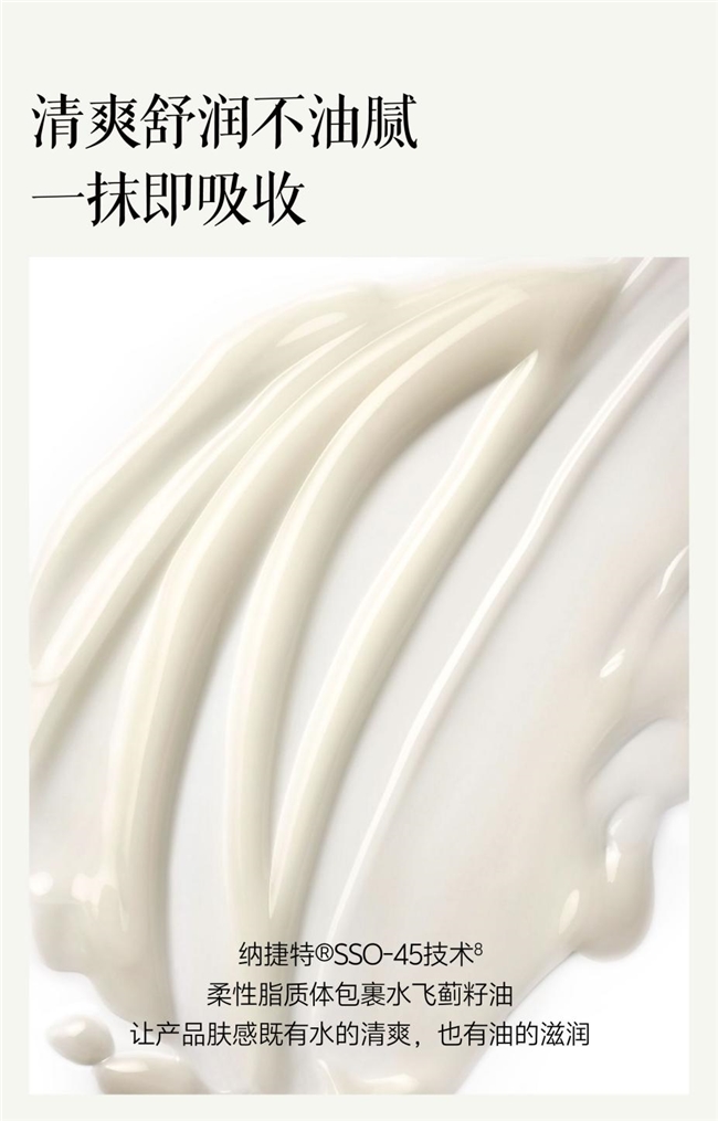 运用纳捷特® SSO-45技术,通过柔性脂质体包裹活性物,实现了轻盈质地与深层修护的结合,打破了痘敏肌对修护乳“怕闷痘”的心理防线。